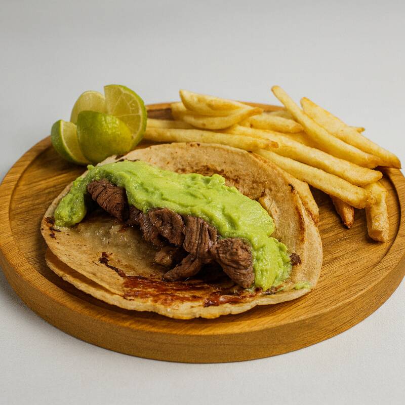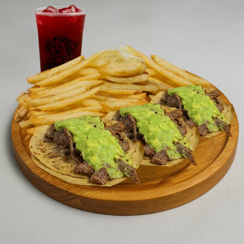 Incluye 3 Tacos XL preparados al momento en plancha, carne jugosa (bistec), doble tortilla de maíz, costra de queso Oaxaca, guacamole fresco y papas fritas crujientes. Incluye agua fresca de 1 litro GRATIS (jamaica). Producto elaborado al momento para conservar sabor y calidad.