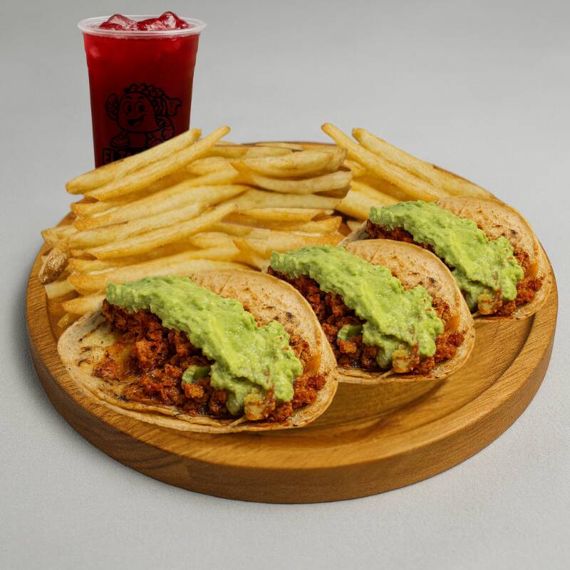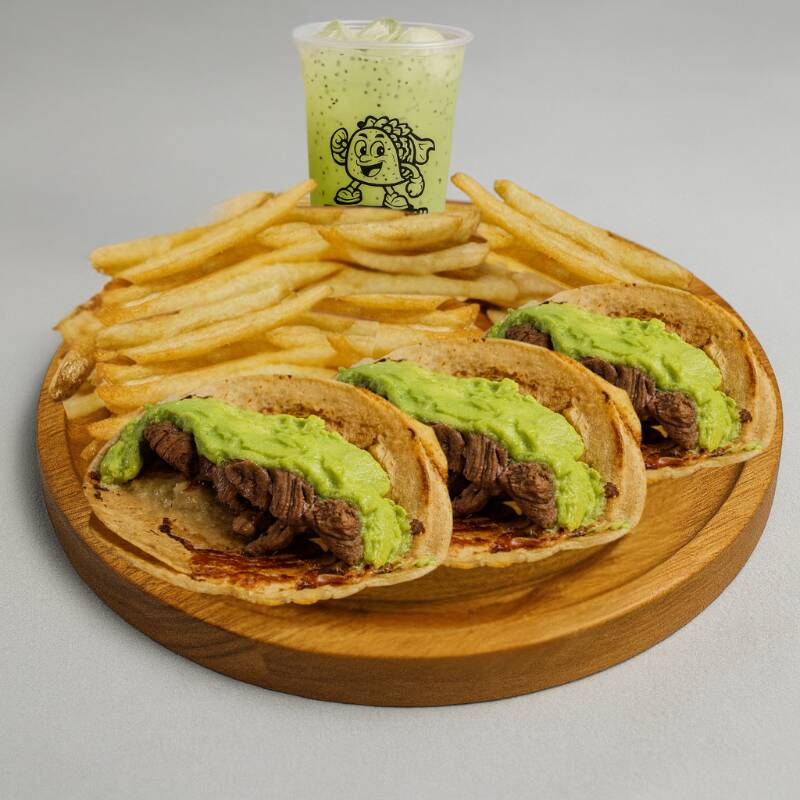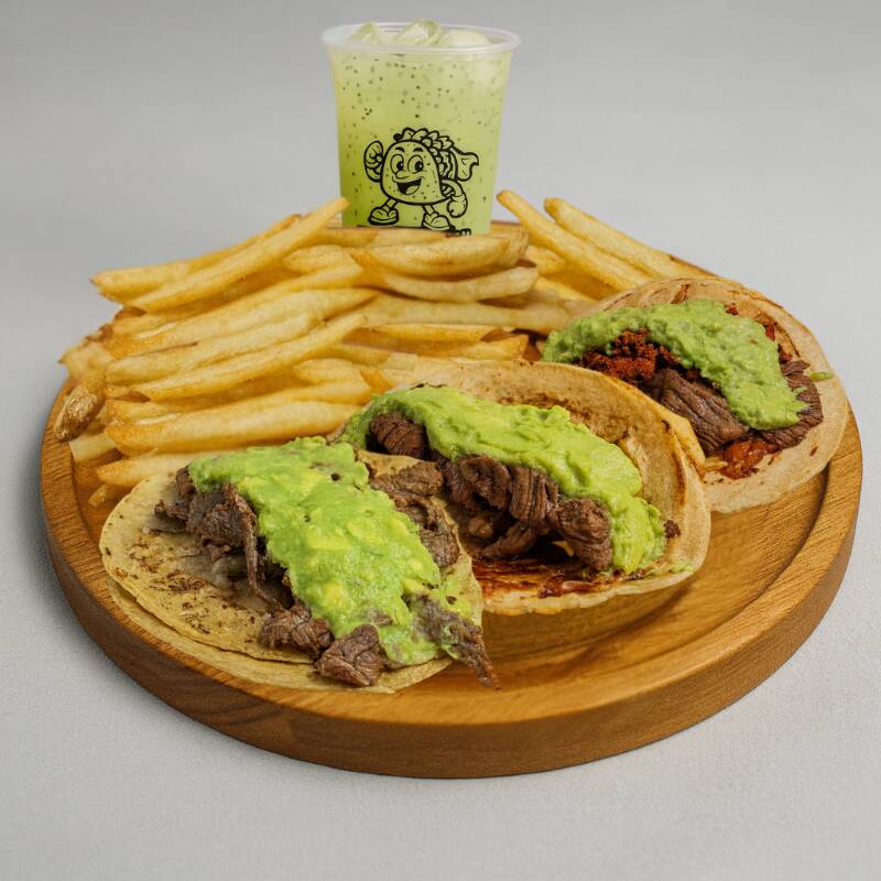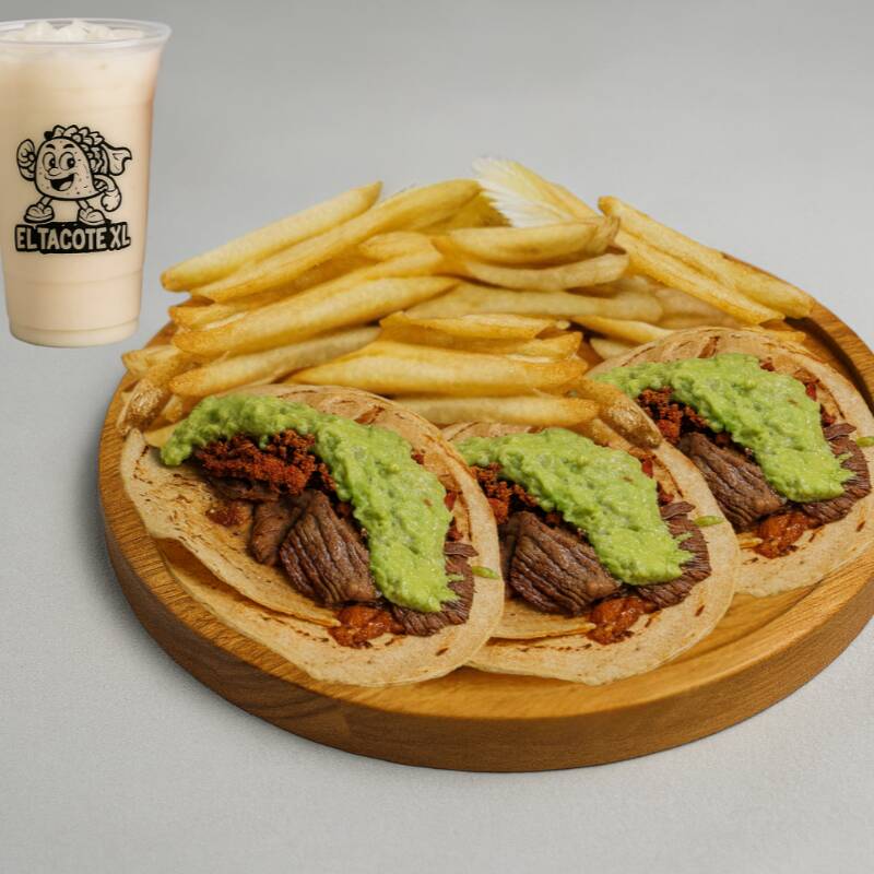 Incluye 3 Tacos XL preparados al momento en plancha, carne jugosa (bistec, campechano, arrachera), doble tortilla de maíz, costra de queso Oaxaca, guacamole fresco y papas fritas crujientes. Incluye agua fresca de 1 litro GRATIS (limon/chia). Producto elaborado al momento para conservar sabor y calidad.