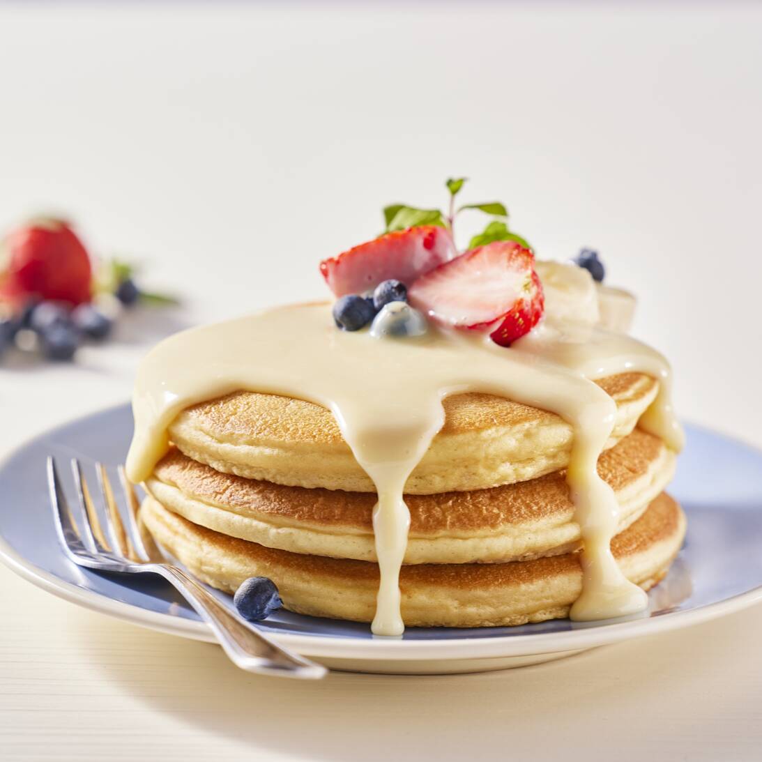 3 Deliciosos y esponjosos hotcakes de 18cm acompañados de miel de maple, tus mermeladas y frutas favoritas.