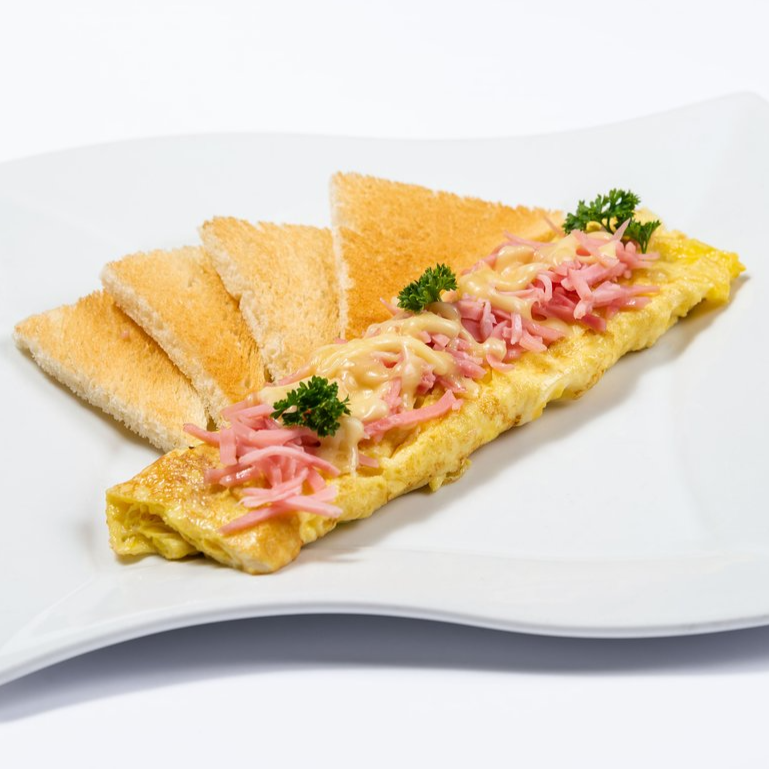 Un omelette de buen tamaño relleno de queso oaxaca, queso americano y jamon ;una fusion que te encantara