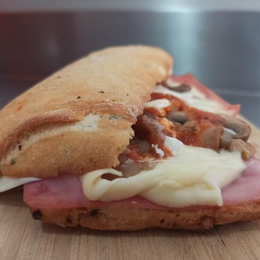 Delicioso pan de ajo y perejil, acompañado de jamón de pavo, combinación de quesos gouda, manchego, mozzarella y Queso Philadelphia, champiñones y salsa de la casa.