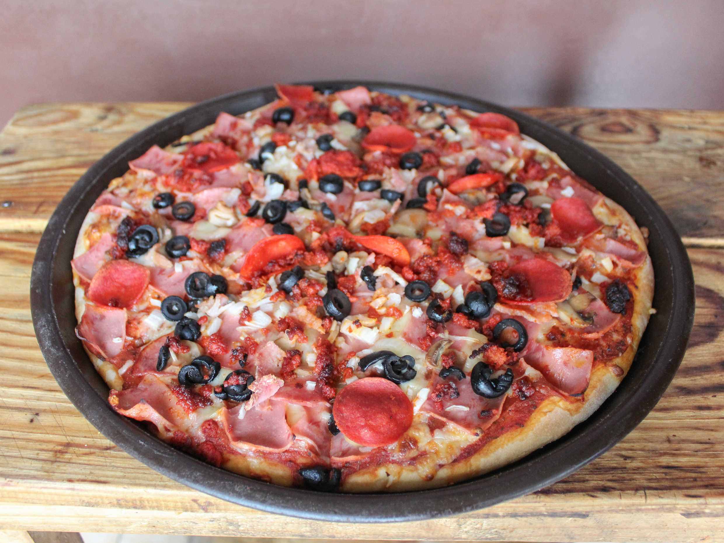 jamón, salami, chorizo, aceituna negra, champiñones, tocino, pepperoni, queso manchego y queso Mozzarella.