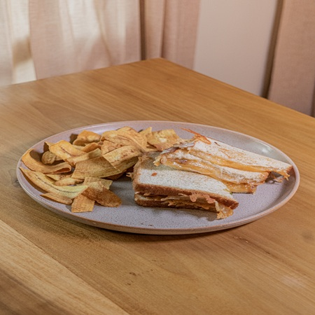 Sándwich de pan brioche, con mezcla de quesos, queso de cabra y un toque de alioli de ajo rostizado y pesto casero. Servido con chips de plátano crujientes.