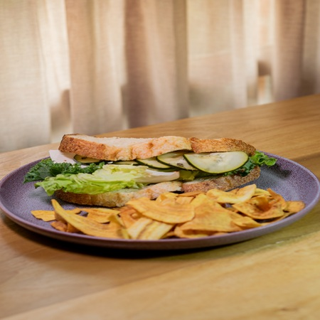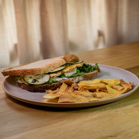 Pan de masa madre con alioli y pesto, relleno de queso panela, hojas frescas y pepinillos agridulces. Acompañado de chips de plátano crujientes.