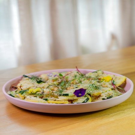Quinoa esponjosa con jugo y ralladura de limón, combinada con láminas de pepino, hinojo y trozos de manzana jugosa. Todo acompañado de nueces tostadas y un delicado toque de aceite de albahaca.