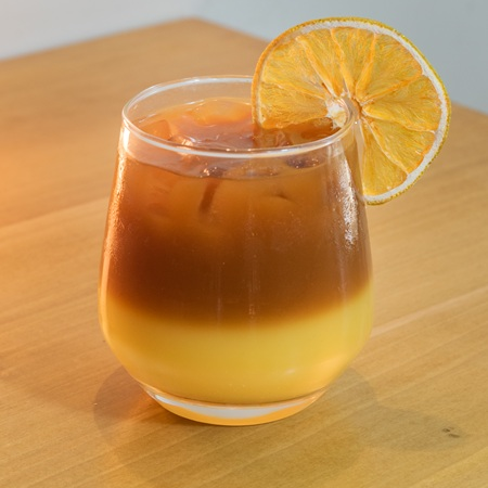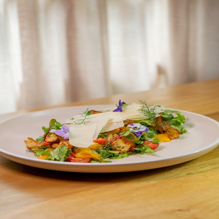 Ensalada fresca con tomate, duraznos dulces, supremas de naranja y crutones dorados de pan de masa madre. Todo aderezado con una vinagreta cítrica, albahaca, hierbas verdes y parmesano en lajas