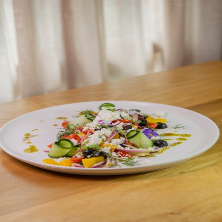 Una combinación de jitomates frescos, pepino crujiente, pimientos, cebolla morada y aceitunas kalamata, acompañados de cubos de queso feta y aderezados con aceite de oliva extra virgen, orégano y un toque de limón.
