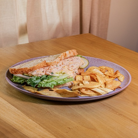 Pan de masa madre, relleno con ensalada de atún fresca (cebolla morada, apio y mayonesa), queso cheddar y puré de aguacate. Servido con chips de plátano crujientes