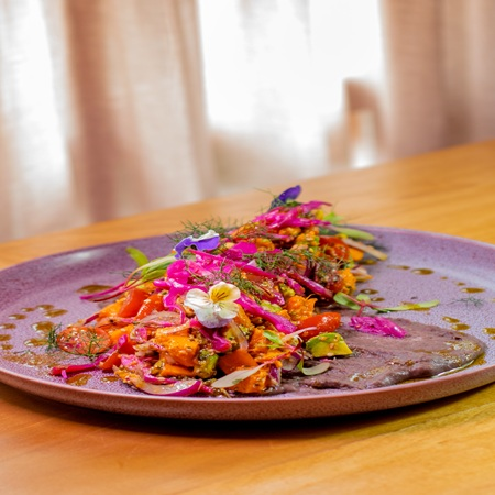 Camote asado en cubos con frijoles negros, cebolla morada, cubos de aguacate, col encurtida, con tomate cherry y ajonjolí bañada en pesto. Una opción saludable, vibrante y llena de texturas y colores.