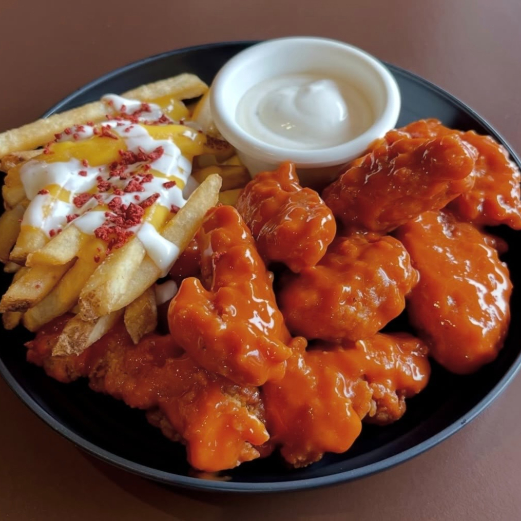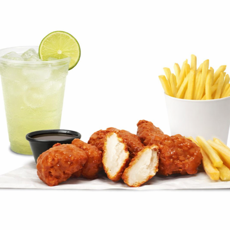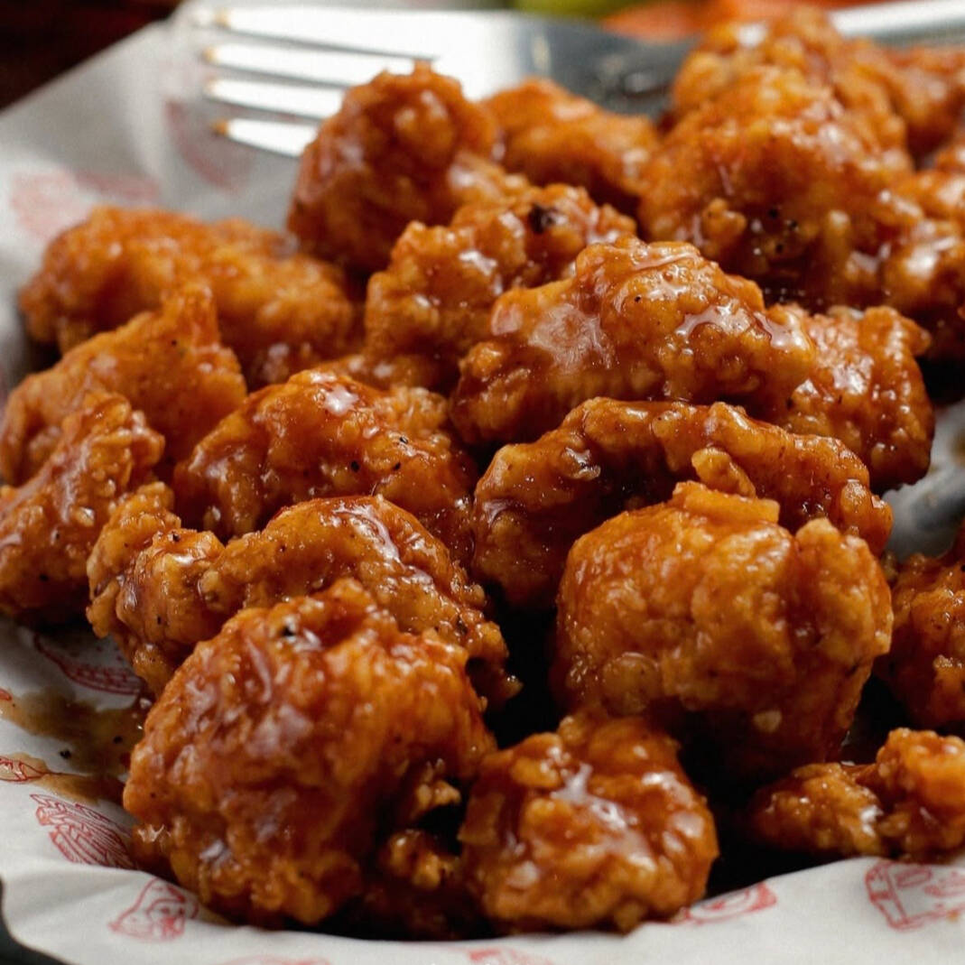 Pedazos de pollo frito, bañado en salsa, elegir, Red Hot o BBQ