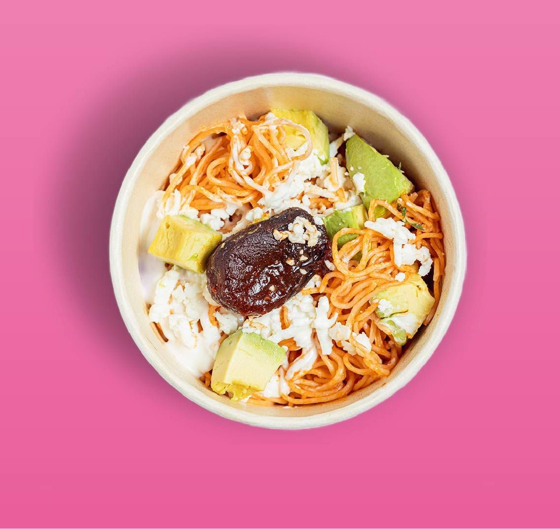 Fideos con un toquecito de chipotle, crema, queso fresco, cilantro y aguacate.