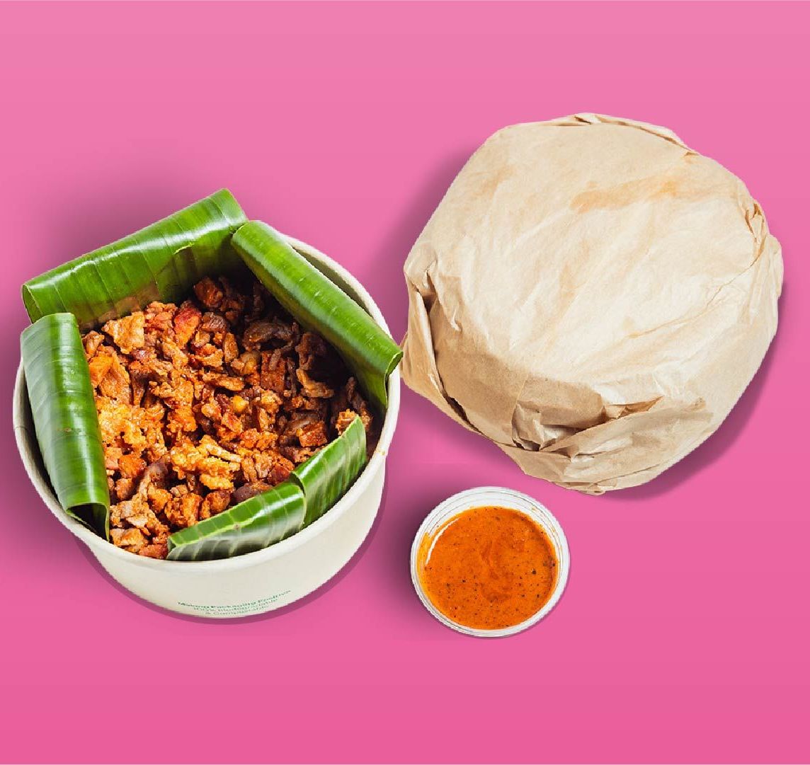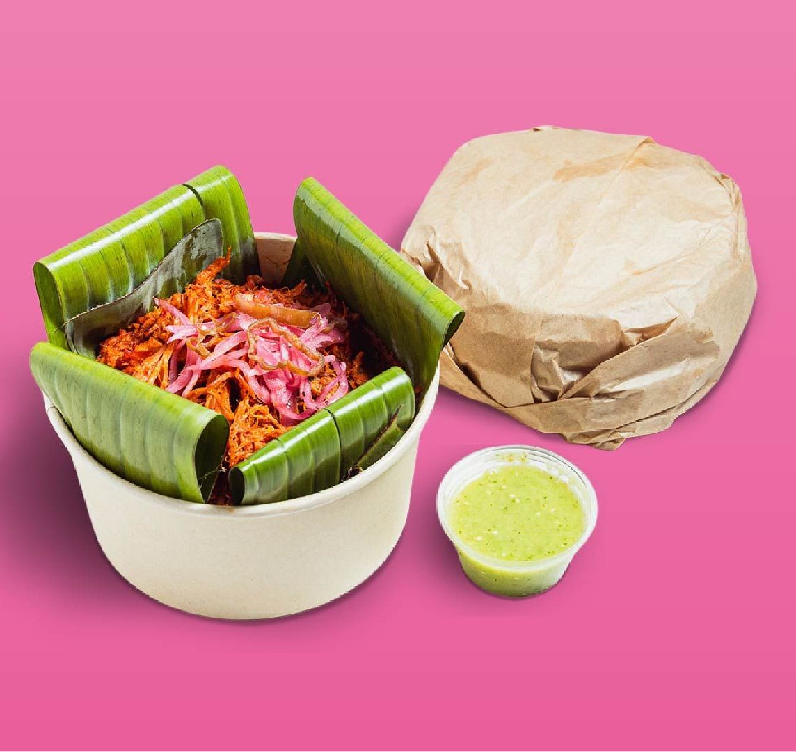 Abundante cochinita marinada con receta tradicional, acompañada de cebollita xni-pec, salsa verde cruda + medio kilo de tortillas recién hechas. ¡Rinde para 10 tacos!