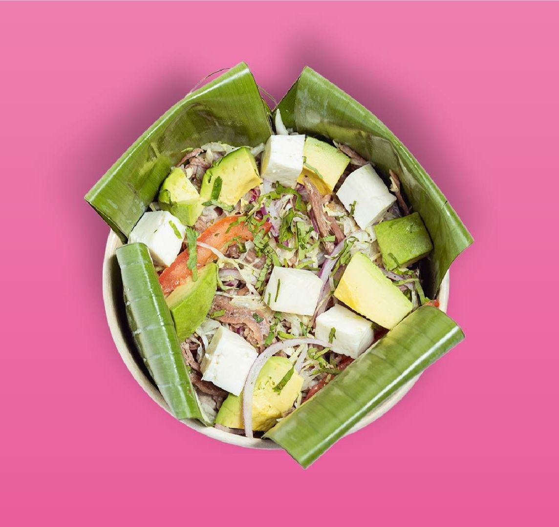 Res deshebrada con arroz verde poblano, aguacate fresco, queso panela y un toque de chipotle. (Incluye tostadas)