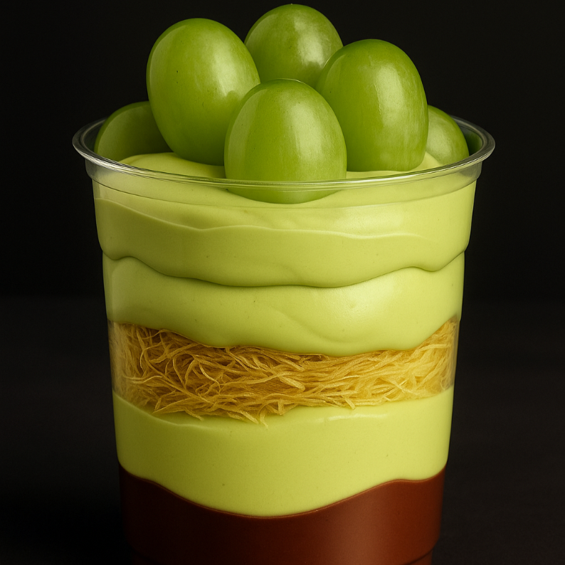 capas de uvas verdes frescas con finas capas de pasta filo crujiente, mantequilla de pistache ,con capas de chocolate de fuente y pistache crujiente y tostado por encima