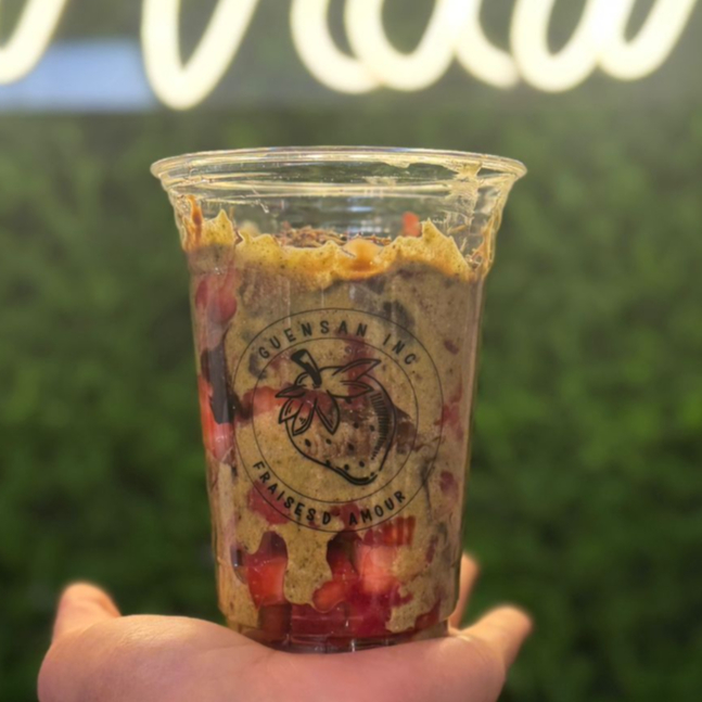 capas de fresa fesca con capas de mousse de matcha y toppings a elegir