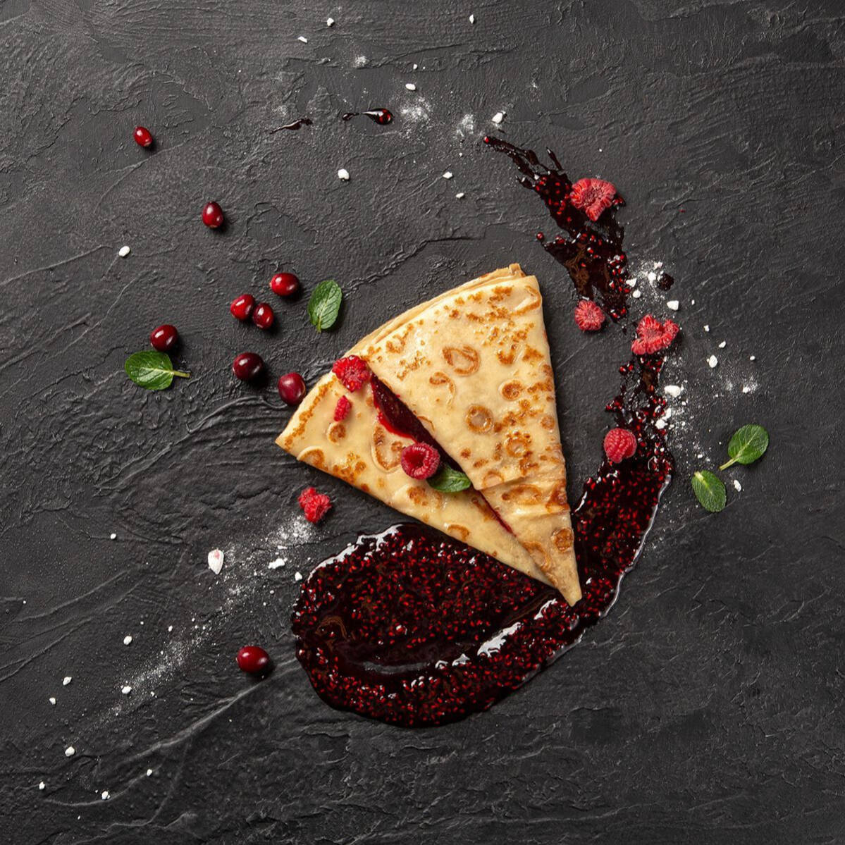 capas de fresa fresca con finas capas de pasta filo crujiente, mantequilla de pistache ,con capas de chocolate de fuente y pistache crujiente y tostado por encima