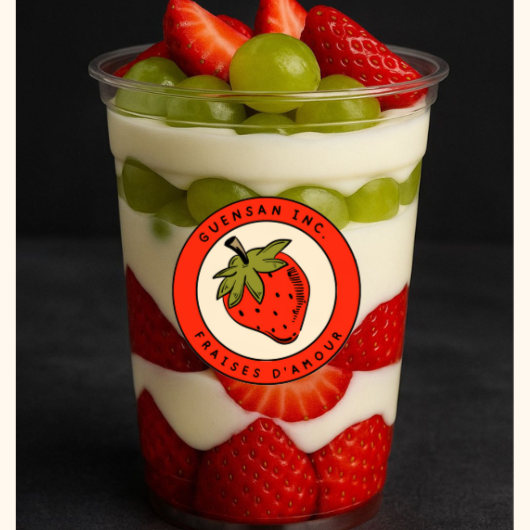 capas de fresa picada y capas de uvas verdes con capas de crema original y toppings a elegir