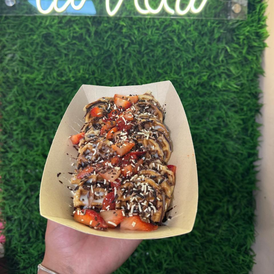 10 MINI WAFFLES RECIEN HECHOS CUBIERTOS CON UN COMPLETMENTO Y UN TOPPING Y FRESAS FRESCAS PICADAS