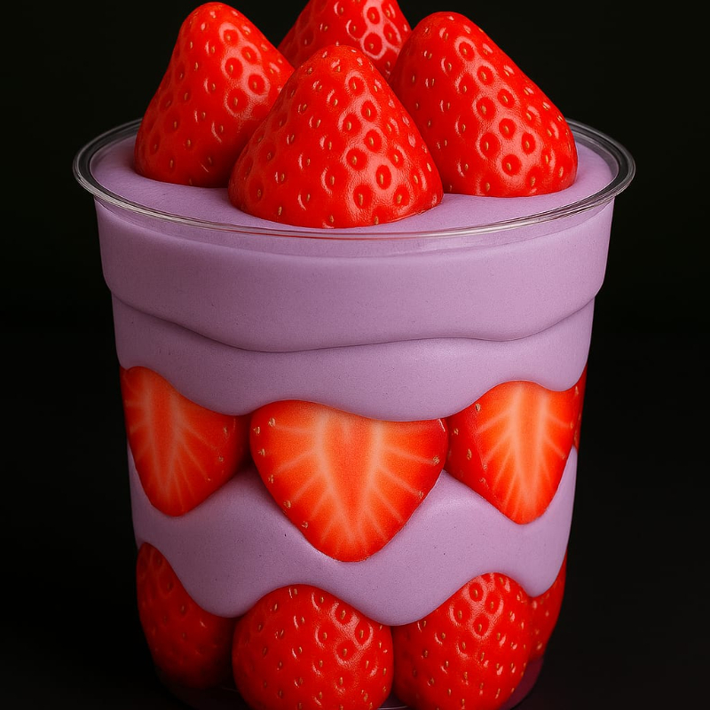 capas de fresa fresca con capas de mousse ligero de sabor taro con toppings a elegir