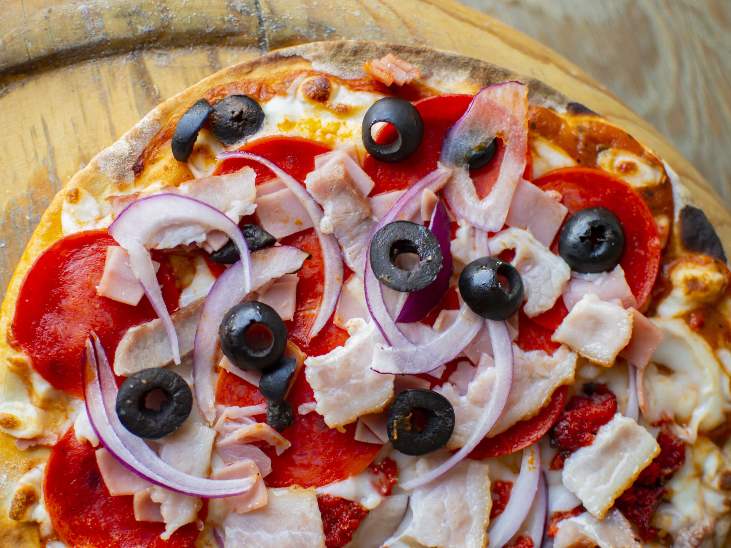 Masa romana de corte fino que resalta los sabores de salchicha, jamón, pepperoni, aceitunas negras y cebolla morada.Con un diametro de 20 cm (4 rebanadas proporcionales) ideal para 1 persona o niño.