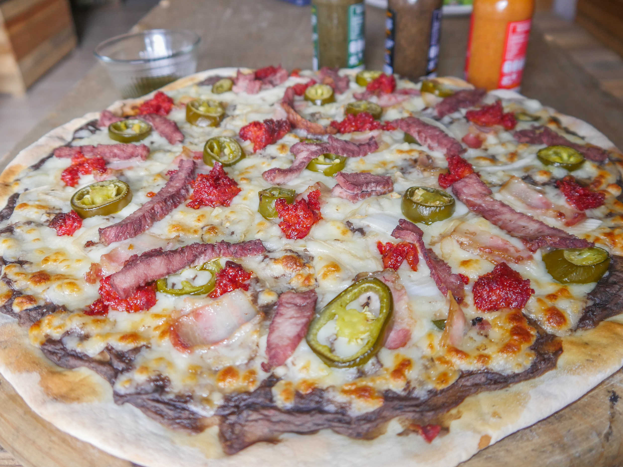 Masa romana de corte fino que resalta los sabores de la salsa de frijol, arrachera, chorizo, queso Oaxaca, chiles nachos, cebolla caramelizada y tocino.Con un diametro de 20 cm (4 rebanadas proporcionales) ideal para 1 persona o niño.
