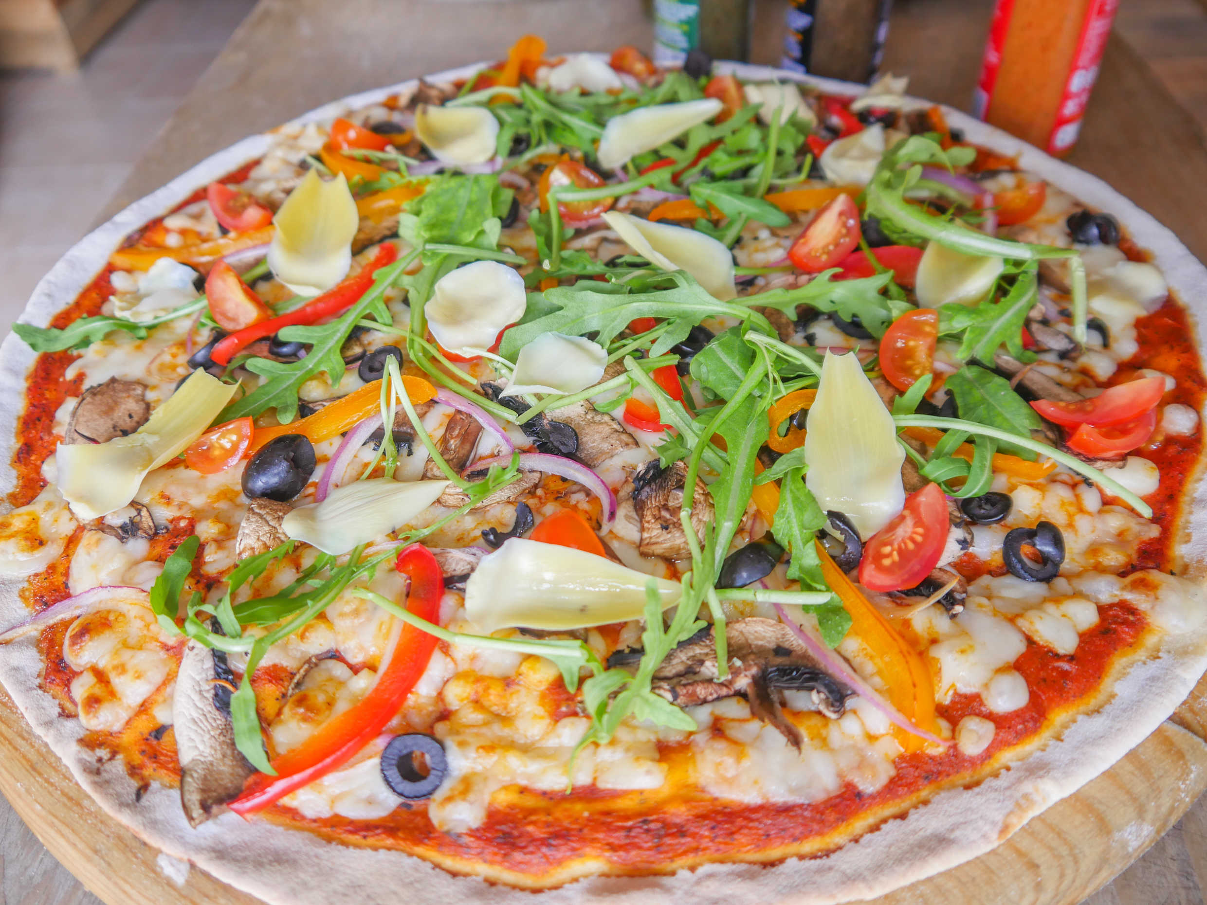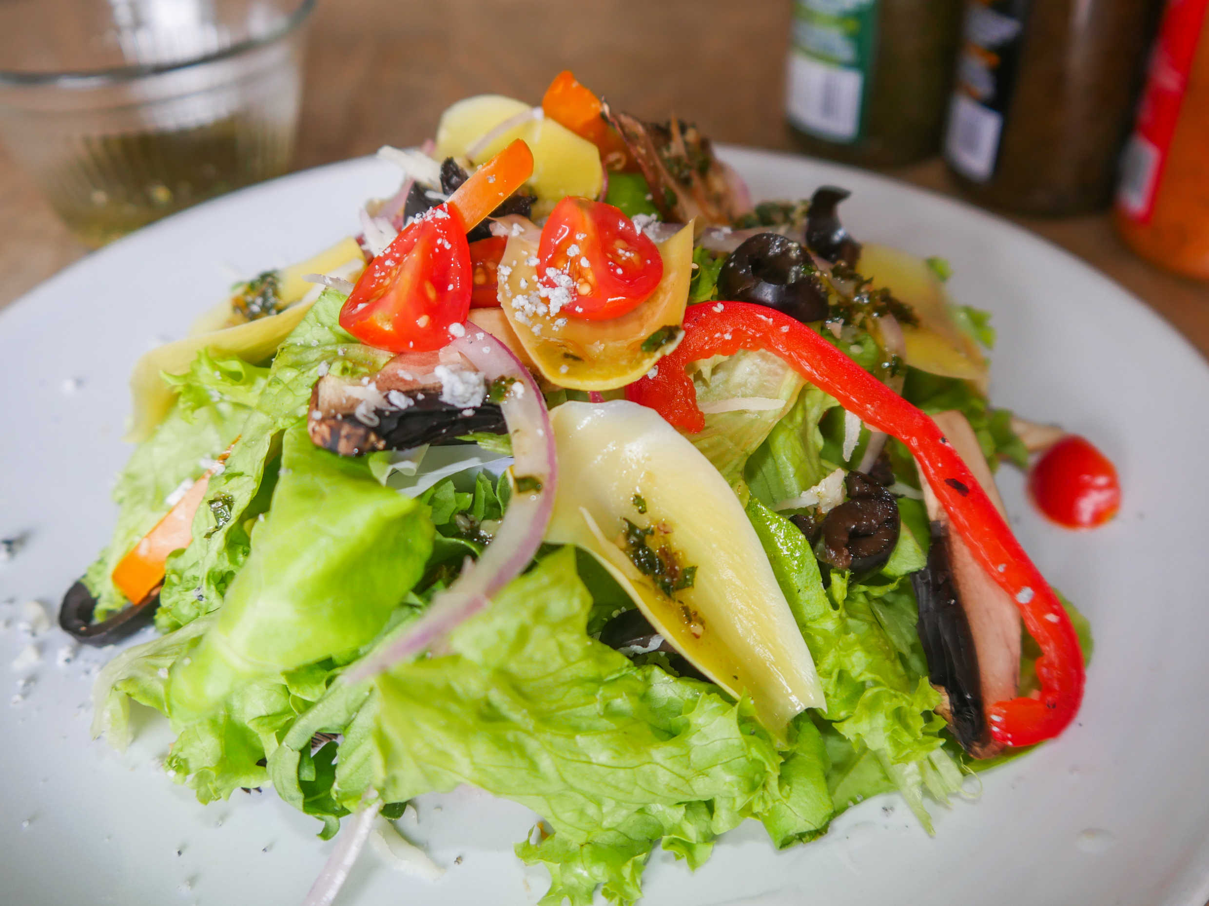 Lechuga, arugula, jitomate,champiñon,portobello,setas,cebolla morada,corazon de alcachofa, pimiento, cherry,aceituna negra,pesto.