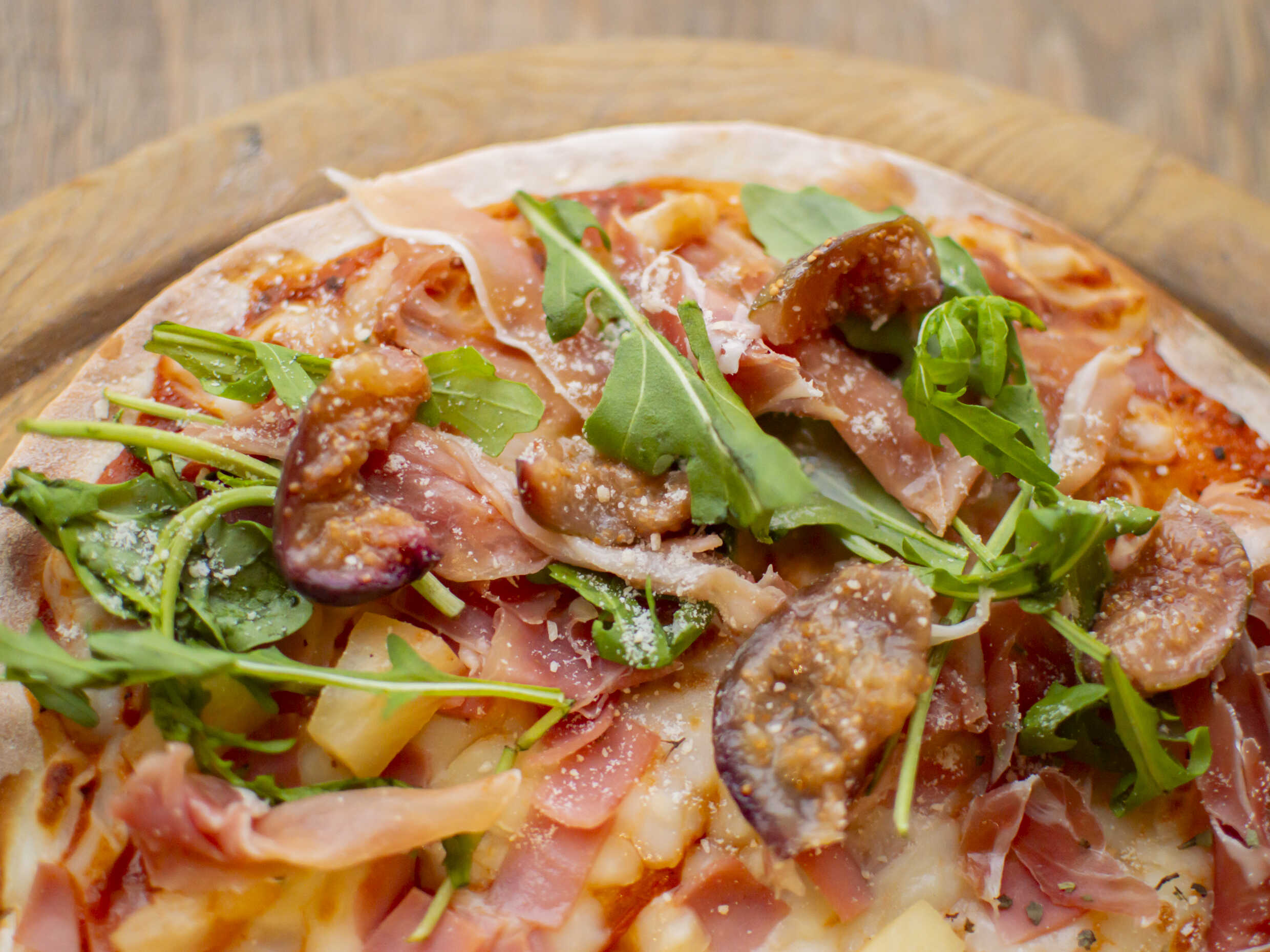 Masa romana de corte fino que resalta los sabores de jamón serrano, arúgula, jitomate cherry y queso parmesano. Con un diametro de 35 cm (8 rebanadas proporcionales)