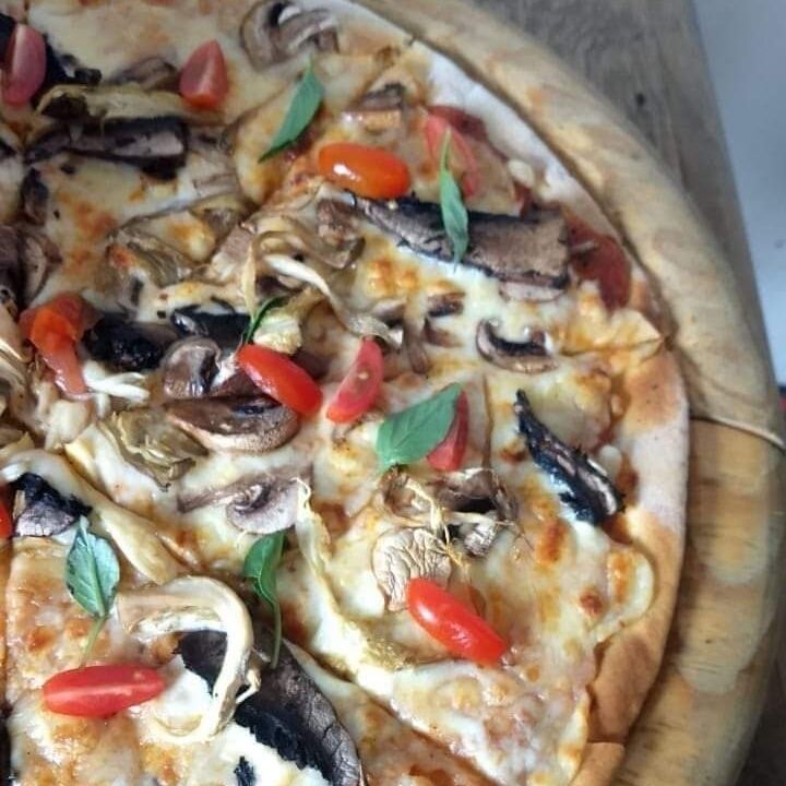 Masa romana de corte fino que resalta los sabores del portobello, champiñón, setas, jitomate cherry y un toque de albahaca. Con un diametro de 35 cm (8 rebanadas proporcionales)