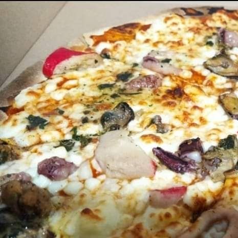 Masa romana de corte fino que resalta los sabores del calamar, camarón, mejillón, pulpo, surimi y salsa pesto.Con un diametro de 35 cm (8 rebanadas proporcionales)