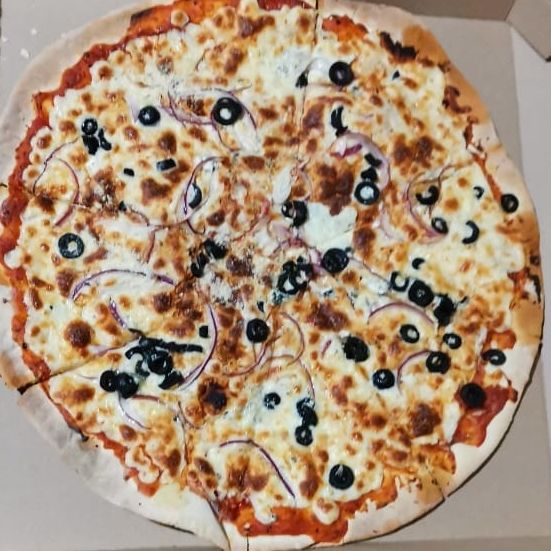 Masa romana de corte fino que resalta los sabores del Queso Provolone ahumado, queso de caabra cenizo, queso parmesano, queso mozarella, aceitunas negras y cebolla morada. Con un diametro de 35 cm (8 rebanadas proporcionales)