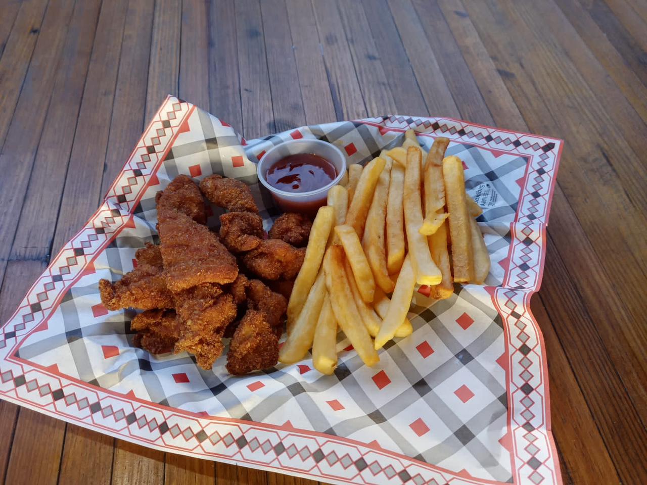 6 Tiras de pollo bañadas en tu salsa favorita con papas a la francesa.