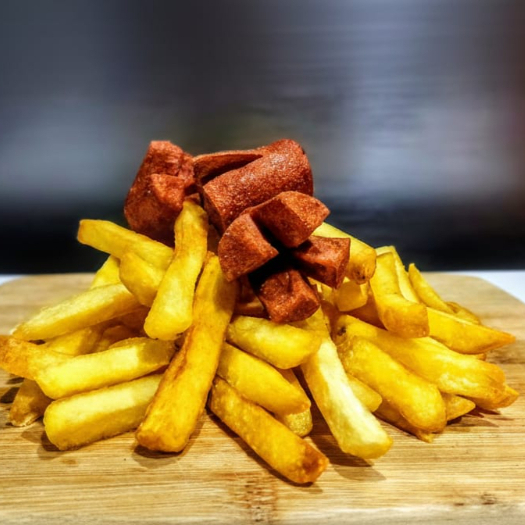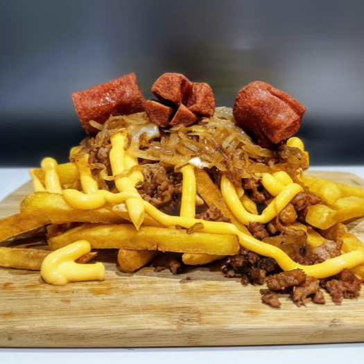 300 g. de papas, con salchipulos, queso para nachos, carne picada y cebolla caramelizada.