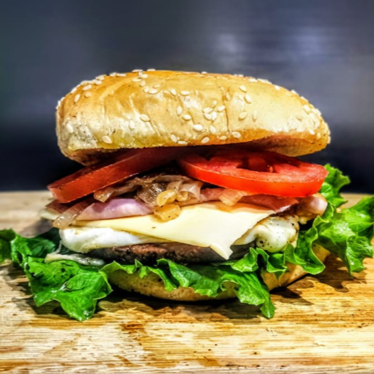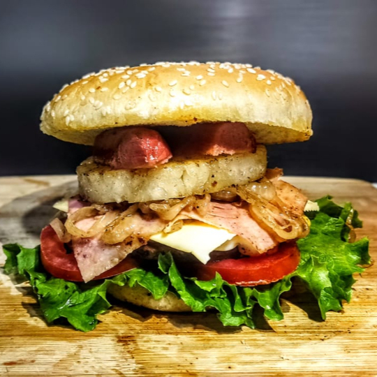 150 gr. de carne Sirloin, queso amarillo, queso mozzarella, jamón, salchicha, cebolla caramelizada, aderezo, lechuga y jitomate