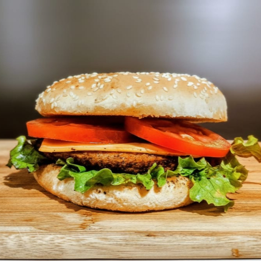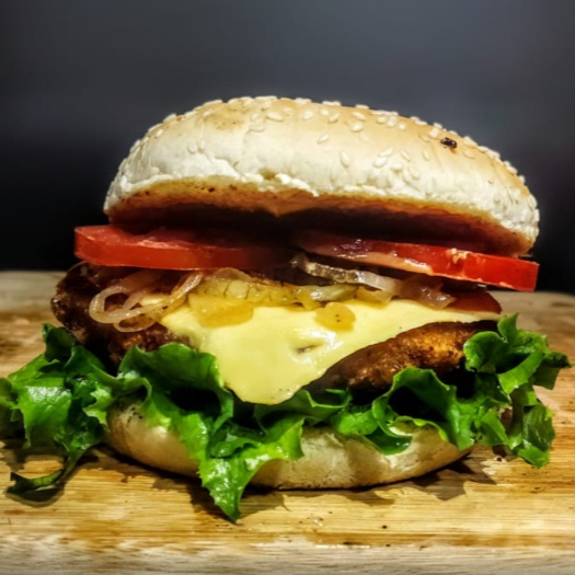 Carne mixta 75g, queso amarillo, lechuga, jitomate y cebolla caramelizada