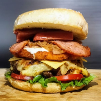 150 gr. de carne mixta, jamón, queso mozzarella, salchicha, salsa BBQ, aros de cebolla, lechuga y jitomate.