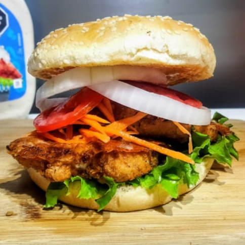 Pollo empanizado bañado en salsa a elegir, aderezo ranch, queso mozzarella, zanahoria rallada, cebolla y jitomate.