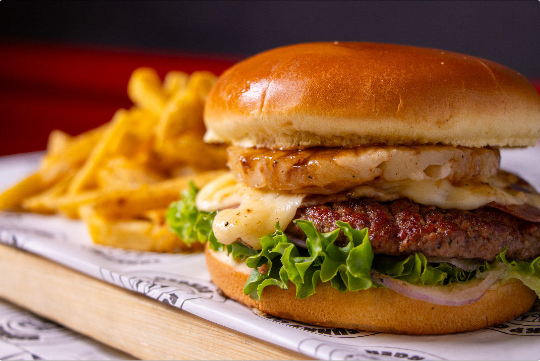 Jugosos 150 g de carne de res con jamón, mozzarella, piña en almíbar, lechuga, que le dan ese toque hawaiano que tanto buscas en cada mordida, acompañados de cebolla, aderezo chipotle y salsa Hawai. Dulce–picosita y playera, con 220 g de papas y refresco.
