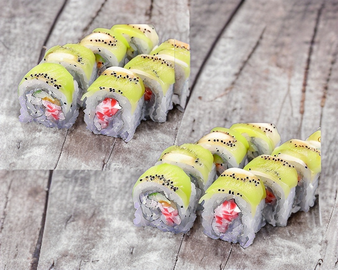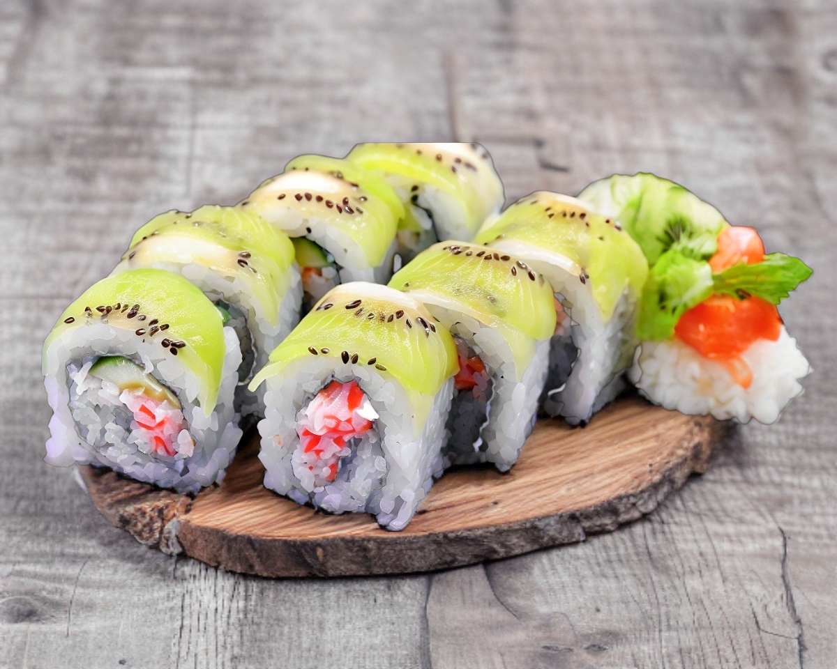8 piezas rellenas de surimi, queso philadelphia, zanahoria y pepino, cubierta de kiwi