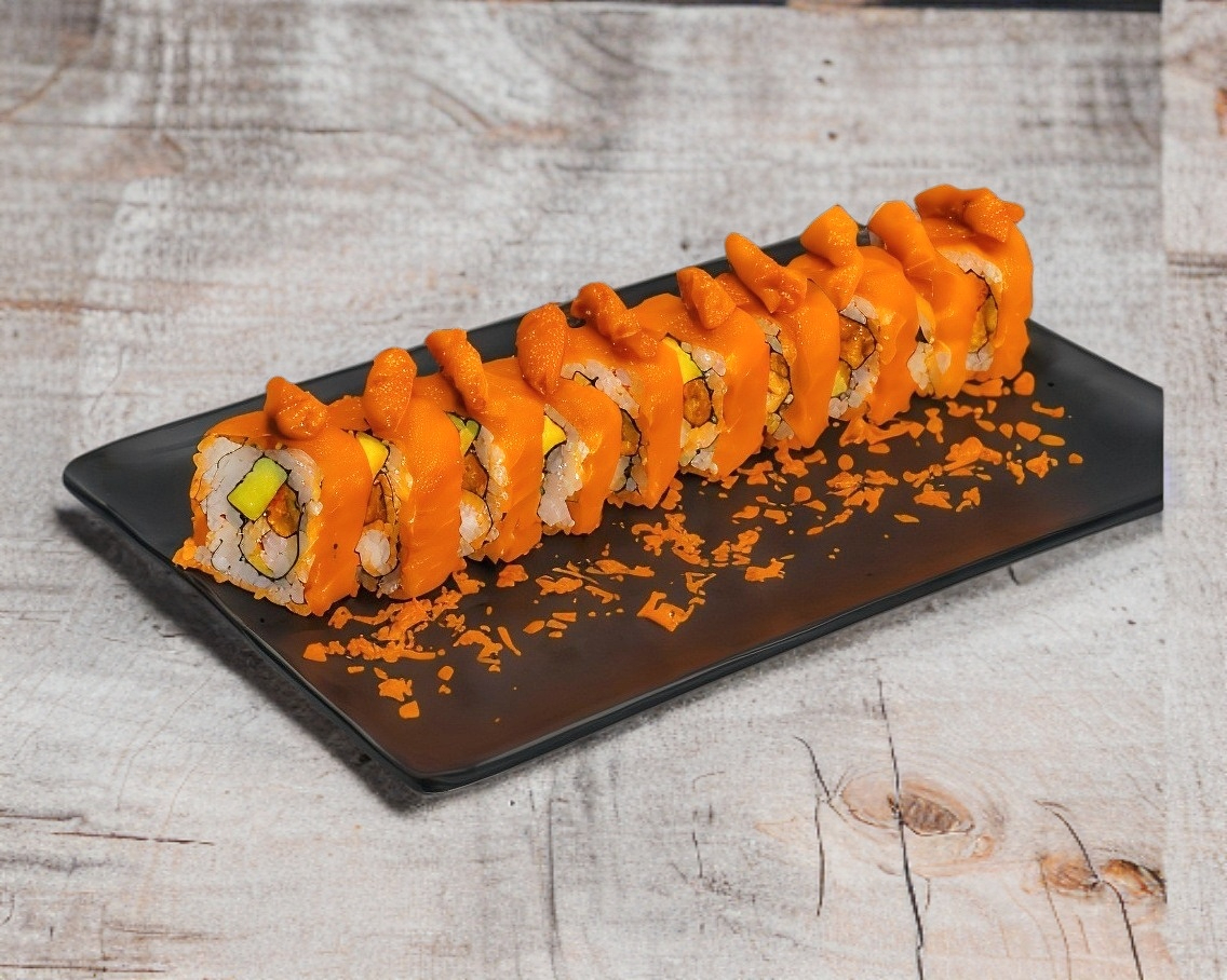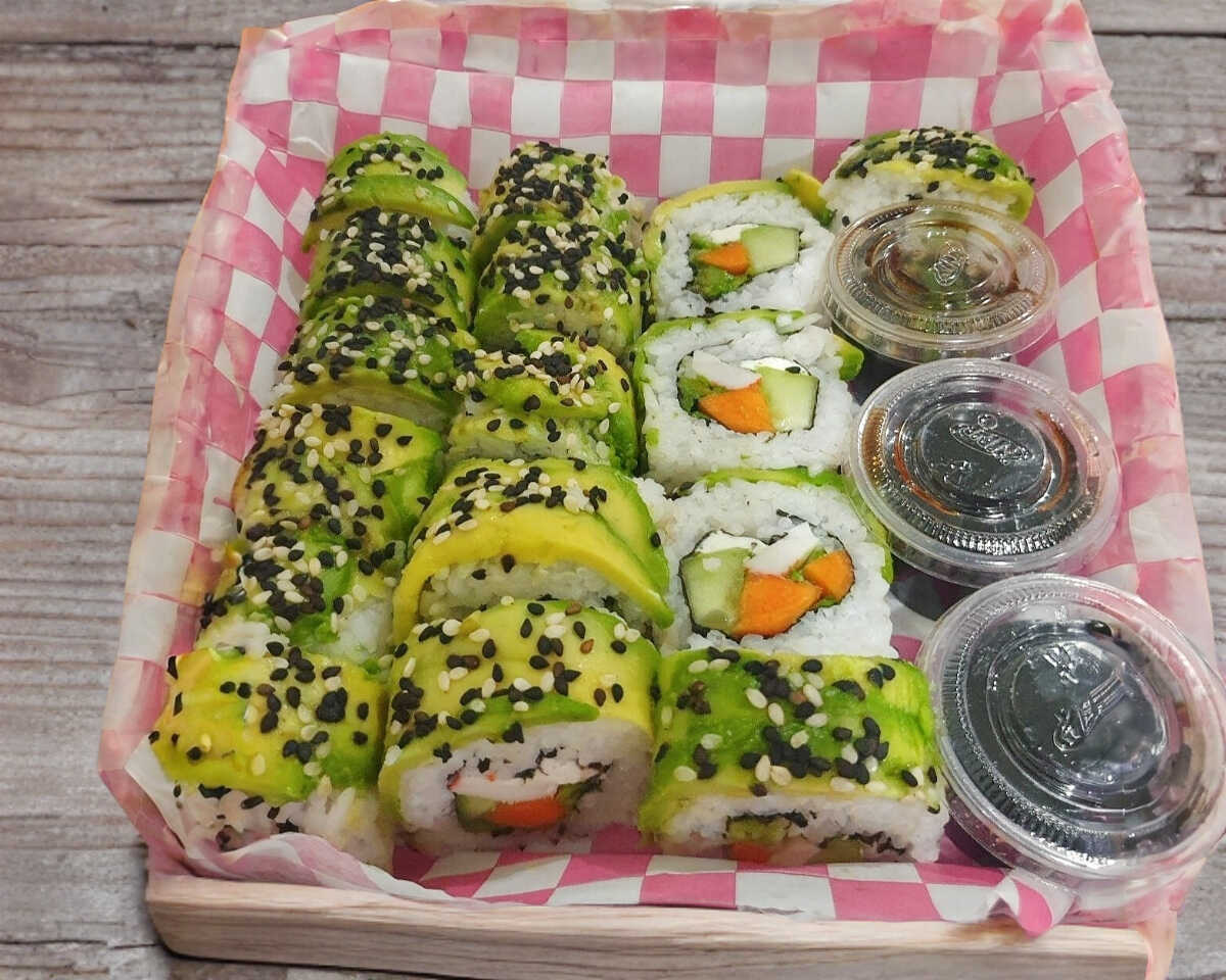 8 rollos rellenos de aguacate , alga por fuera y aderezo de chipotle