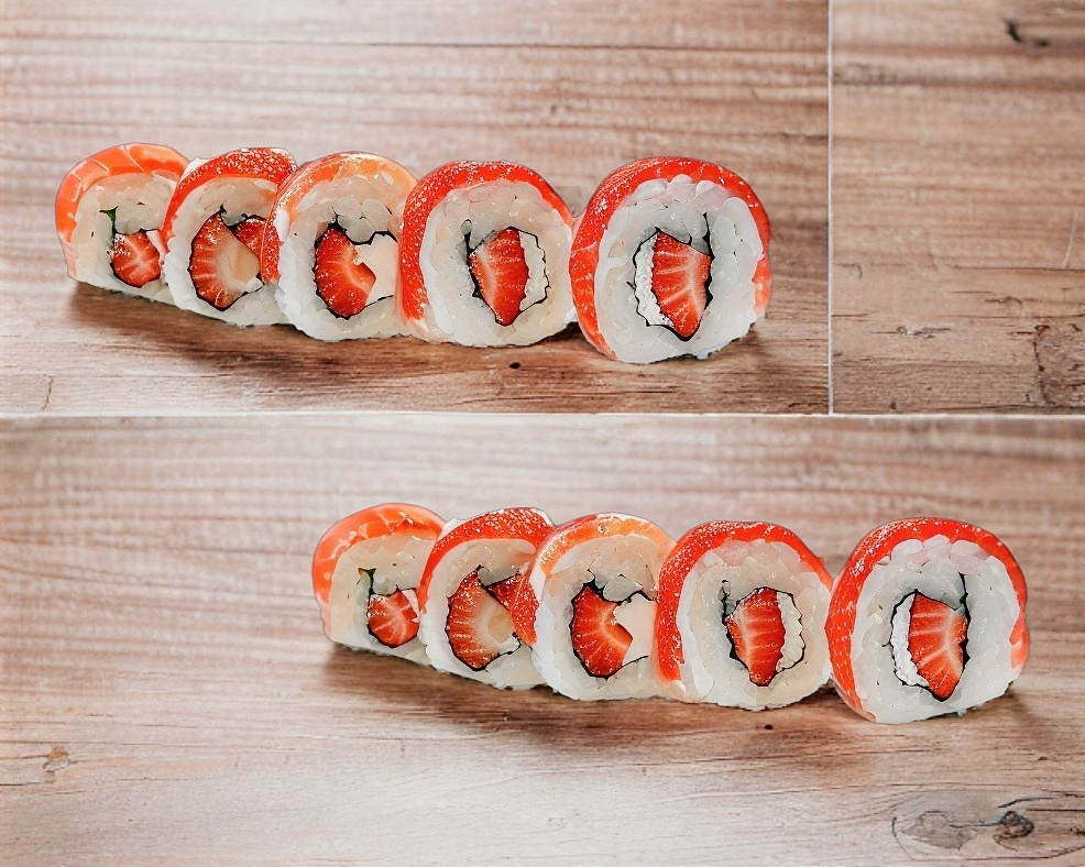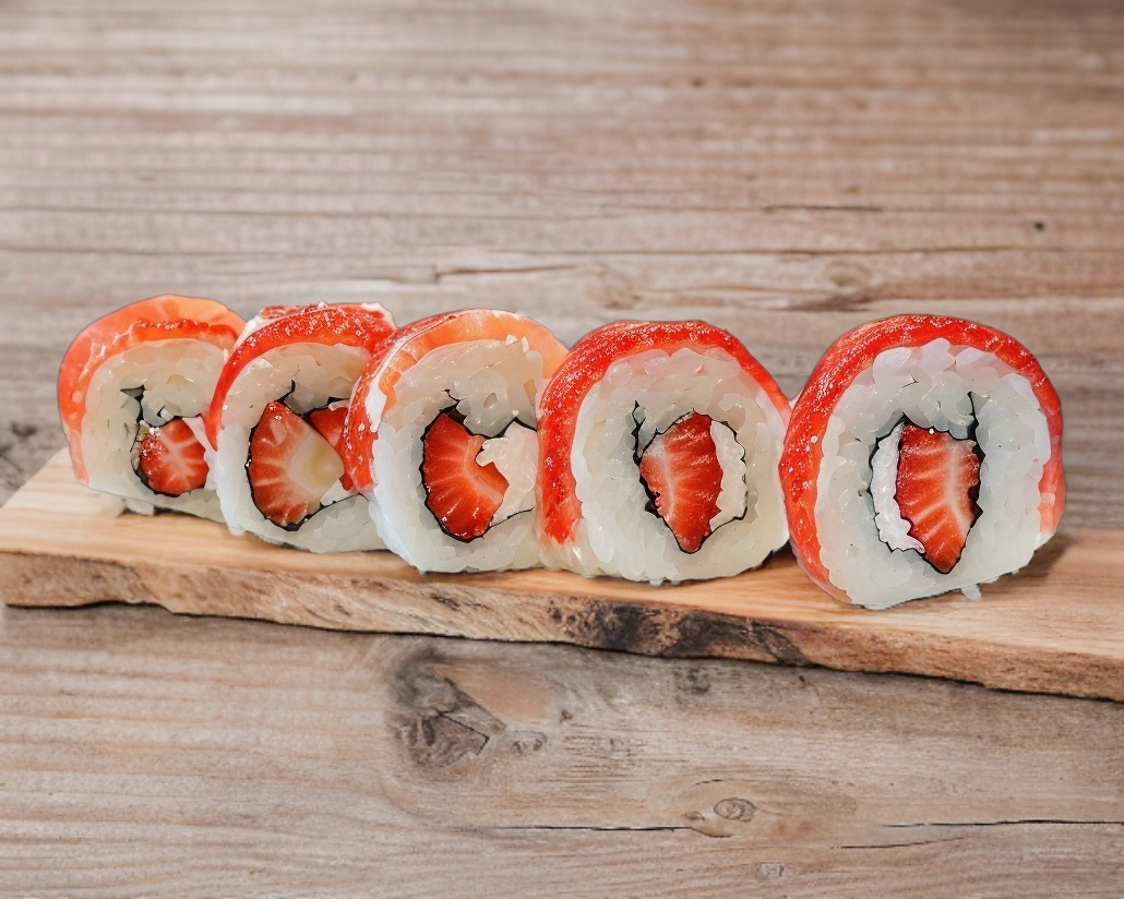 8 piezas rellenas de surimi, queso philadelphia, zanahoria y pepino, cubierta de fresa