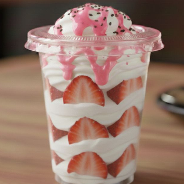 vaso 7oz con fresas, crema, lechera, chantilli y chocolate herseys de fresa