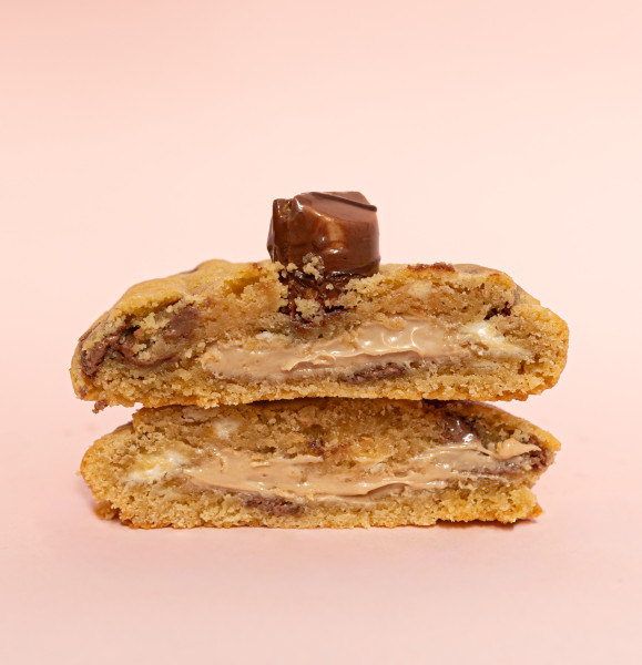 Galleta de vainilla con chips de chocolate blanco y de leche, rellena de crema de Kinder Bueno con topping de Kinder Bueno. 150g