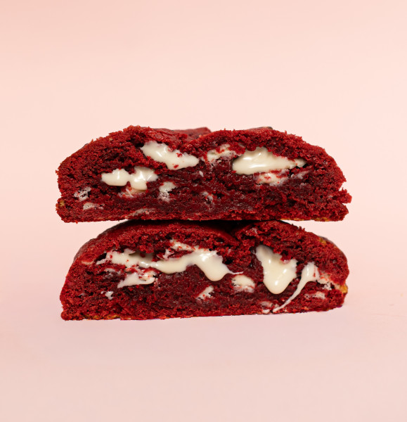 Galleta red velvet, con chips de chocolate blanco rellena de frosting de queso.