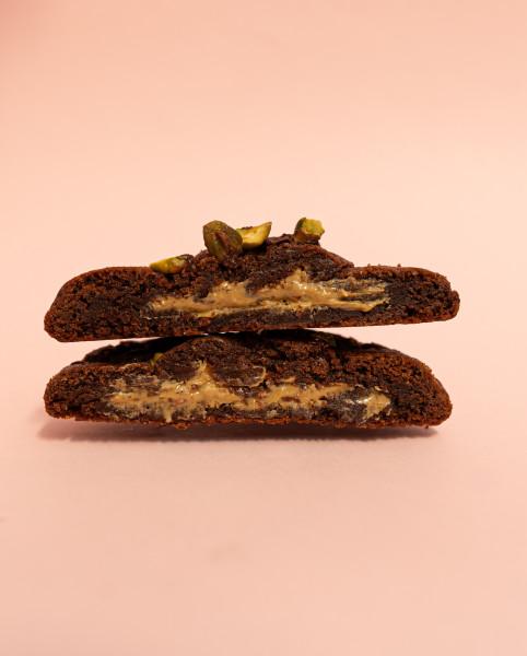 Galleta de brownie rellena de crema de pistache y kataifi cubierta de pistache.150g