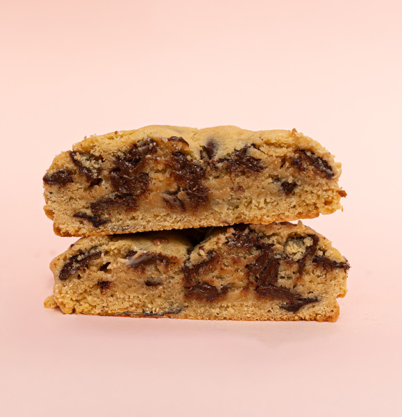 Crookie relleno de galleta de chips de chocolate y Nutella, cubierto de galleta con chips de chocolate espolvoreado con azúcar glass.