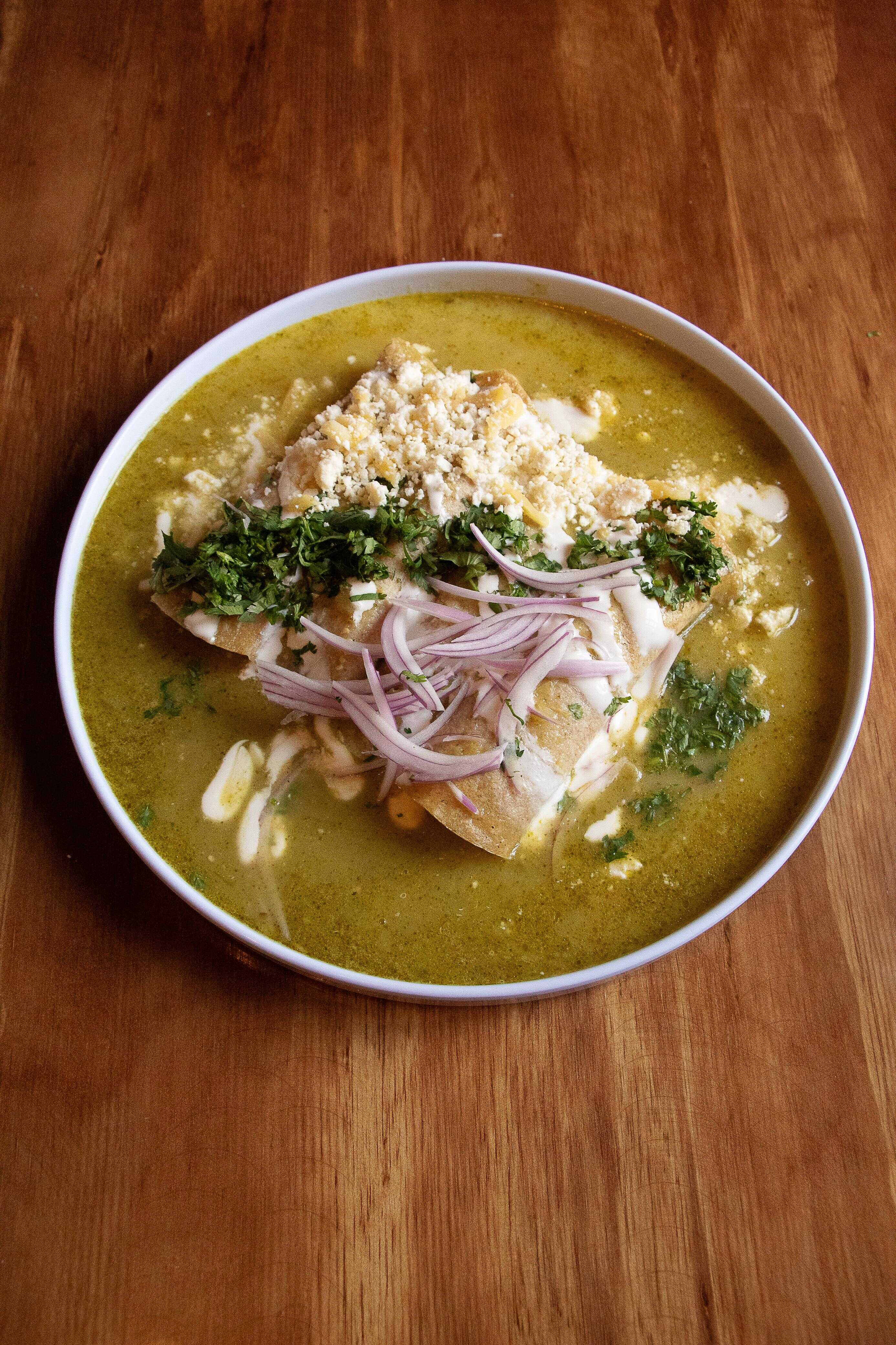 4 piezas de tortilla rellenas de pasta de chorizo con chipotle, bañadas en salsa verde, mezcla de quesos, crema, cebolla morada y cilantro.