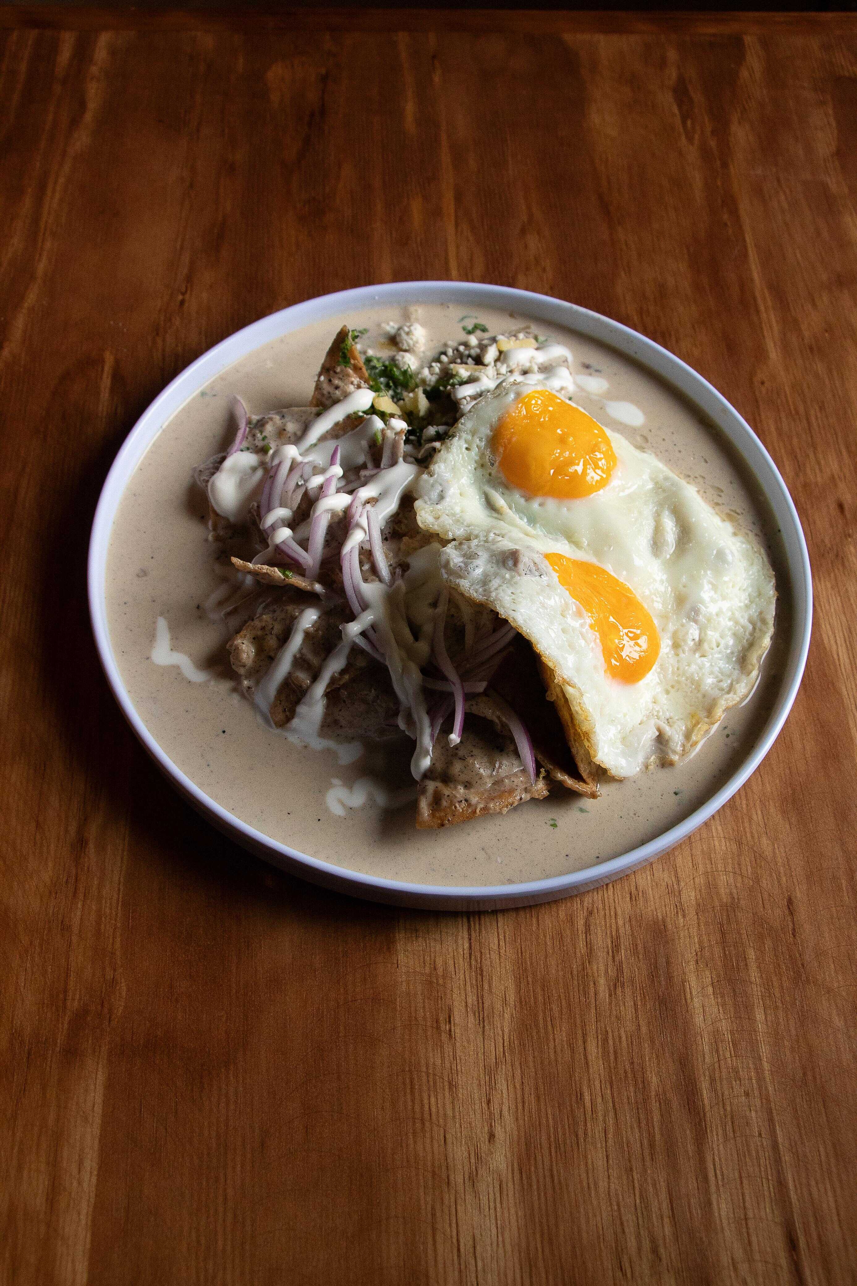 Totopos bañados en salsa blanca a base de mantequilla y lácteos, con un toque de habanero. Acompañados de proteína a elegir, cilantro, cebolla morada, mezcla de quesos y crema.