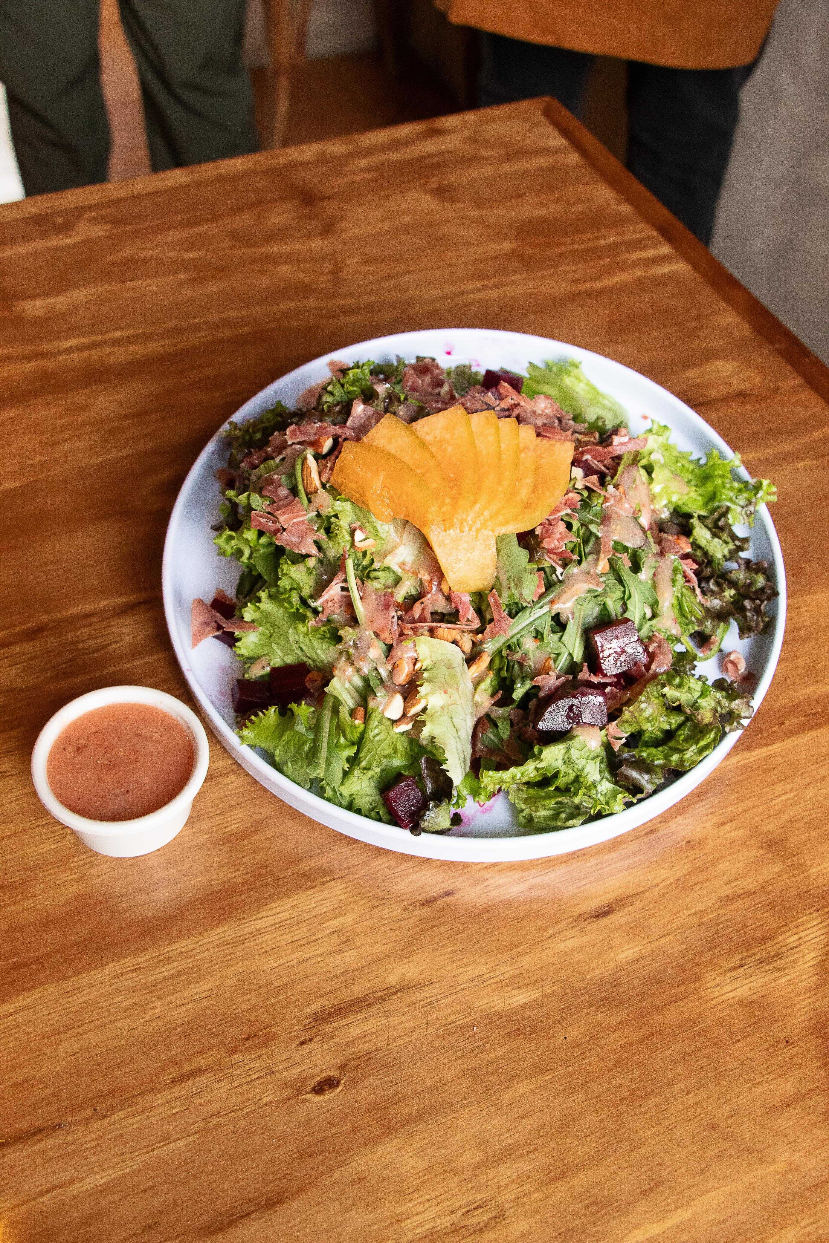 Mix de lechugas y arúgula con betabel dulce, almendra tostada, jamón serrano y melón, acompañado de aderezo de frambuesa.