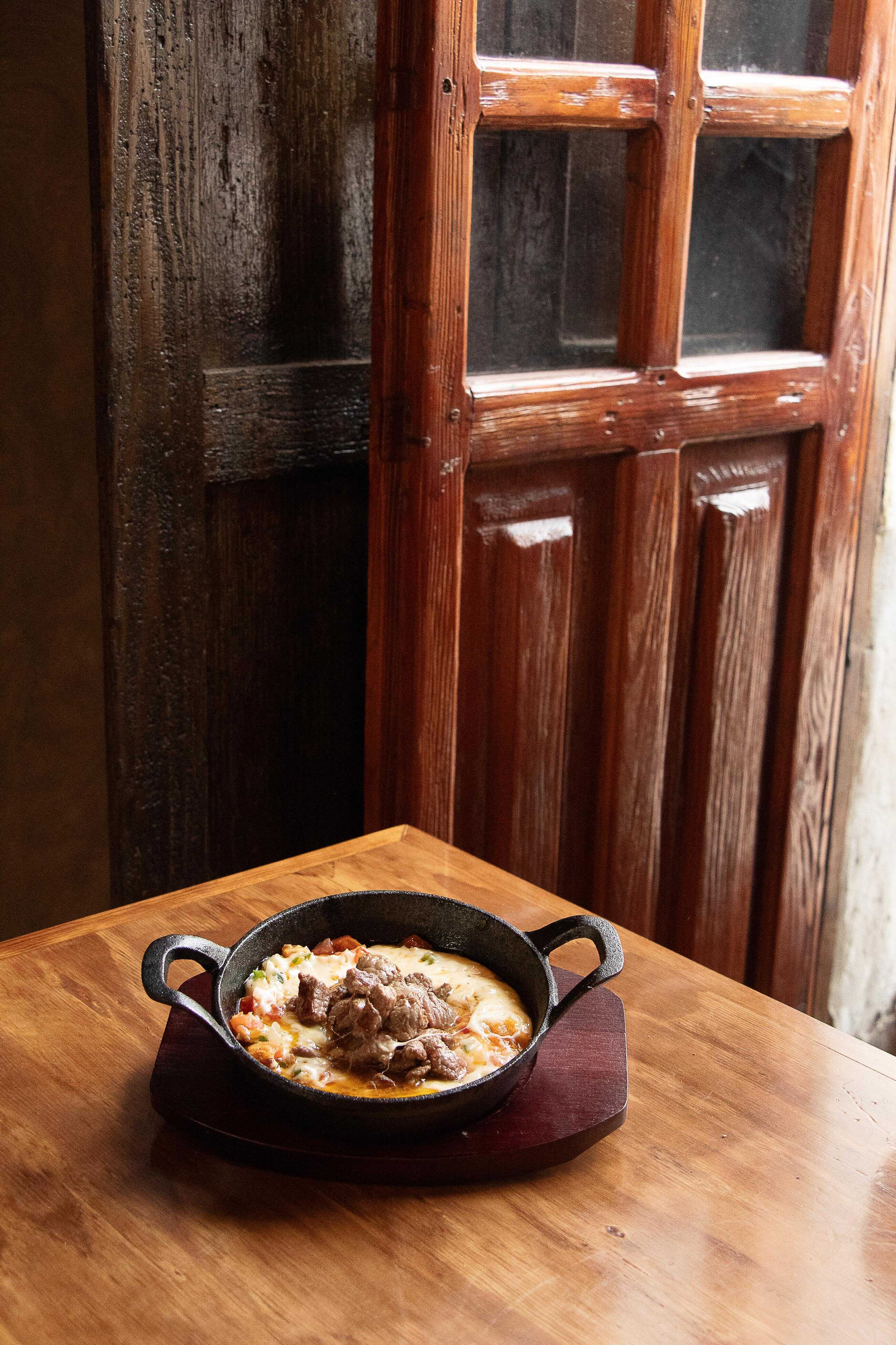 Queso manchego a la mexicana, acompañado de arrachera (100 g) y tres tortillas de harina.