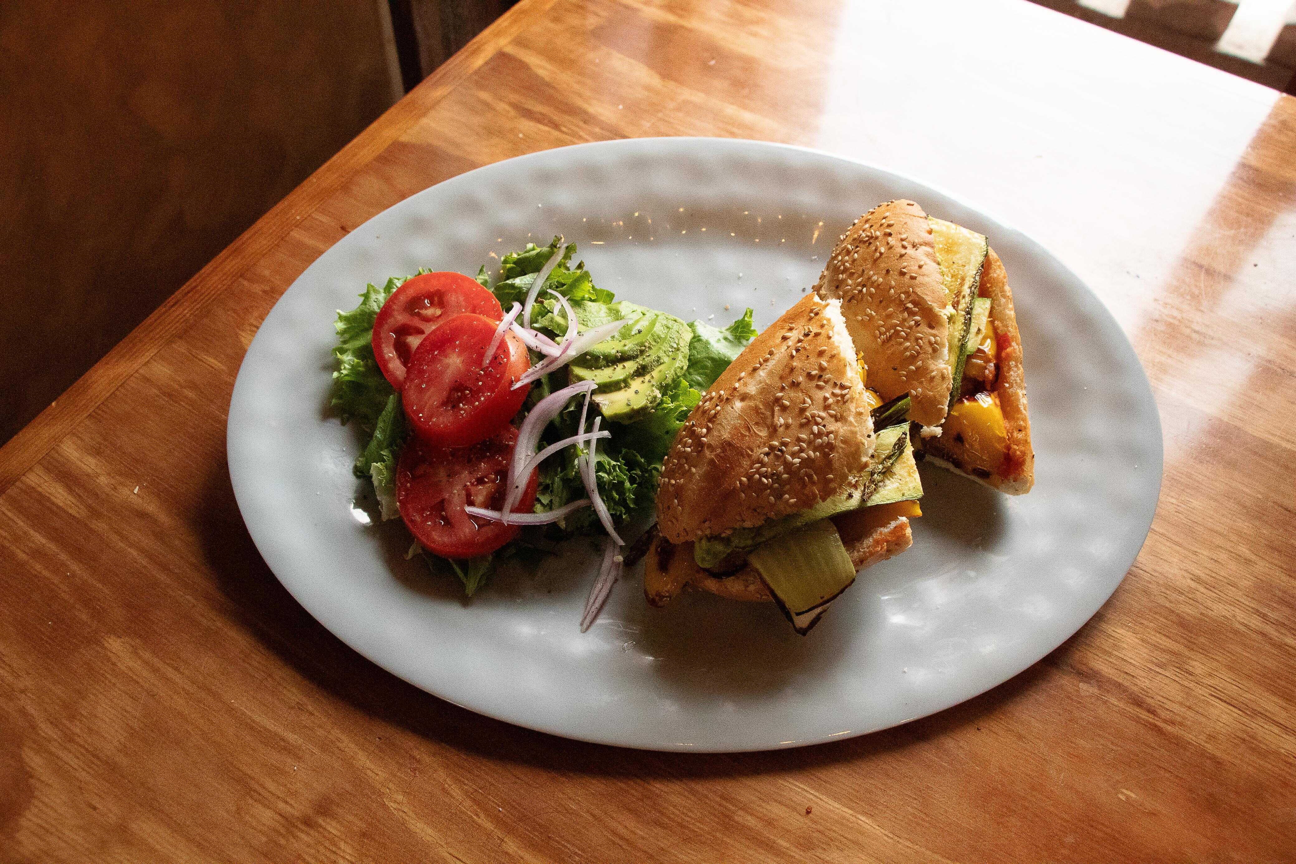 Baguette con aguacate, cassé de tomate, espárragos, calabaza, cebolla, lechuga y pimientos, acompañado de papas a la francesa o ensalada.